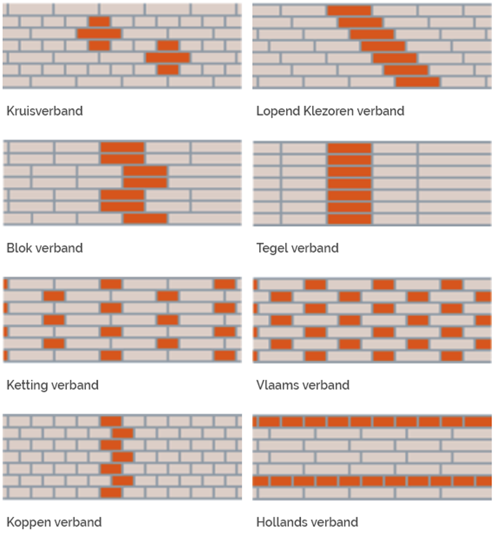 Hieronder schetsen we aan de hand van een aantal muuraanzichten een overzicht van de meest gebruikte metselverbanden.